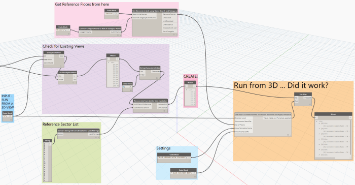 Send a List of Floors to this Node, along with a desired Level and Comments value, and it will make a Section Box 3D view. You will also need to supply View Template Name and View Name Suffix as Strings. It can be used with List.Map as per below to create multiple views for different Comments values.