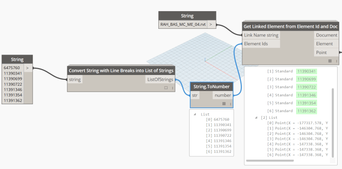 This node takes a String of the RVT Link File name, and a list of Element Ids as Integers, and outputs the matching elements and their location points. It is quite ‘slow’ in processing terms, as it has to collect all element Ids from the Linked document. A similar, faster node in Bakery is Get Linked Element by Link Name Search and Element GUID, but it requires you to know the element GUID first.