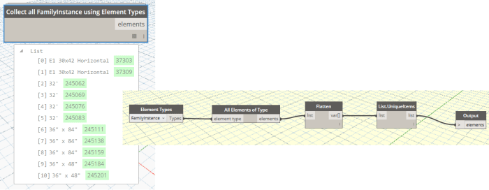 It is often useful to select only the Family Instances (Component Families) from the current document. This can allow easy access to element parameters, or could even be paired with a Family Location node to then access the point coordinates of all family origins. This node takes no inputs, and runs against the current document. It is a simple wrapper of the Element Types and All Elements of Type Standard Nodes, but it uses less screen real estate and is a good building block for more advanced workflows.