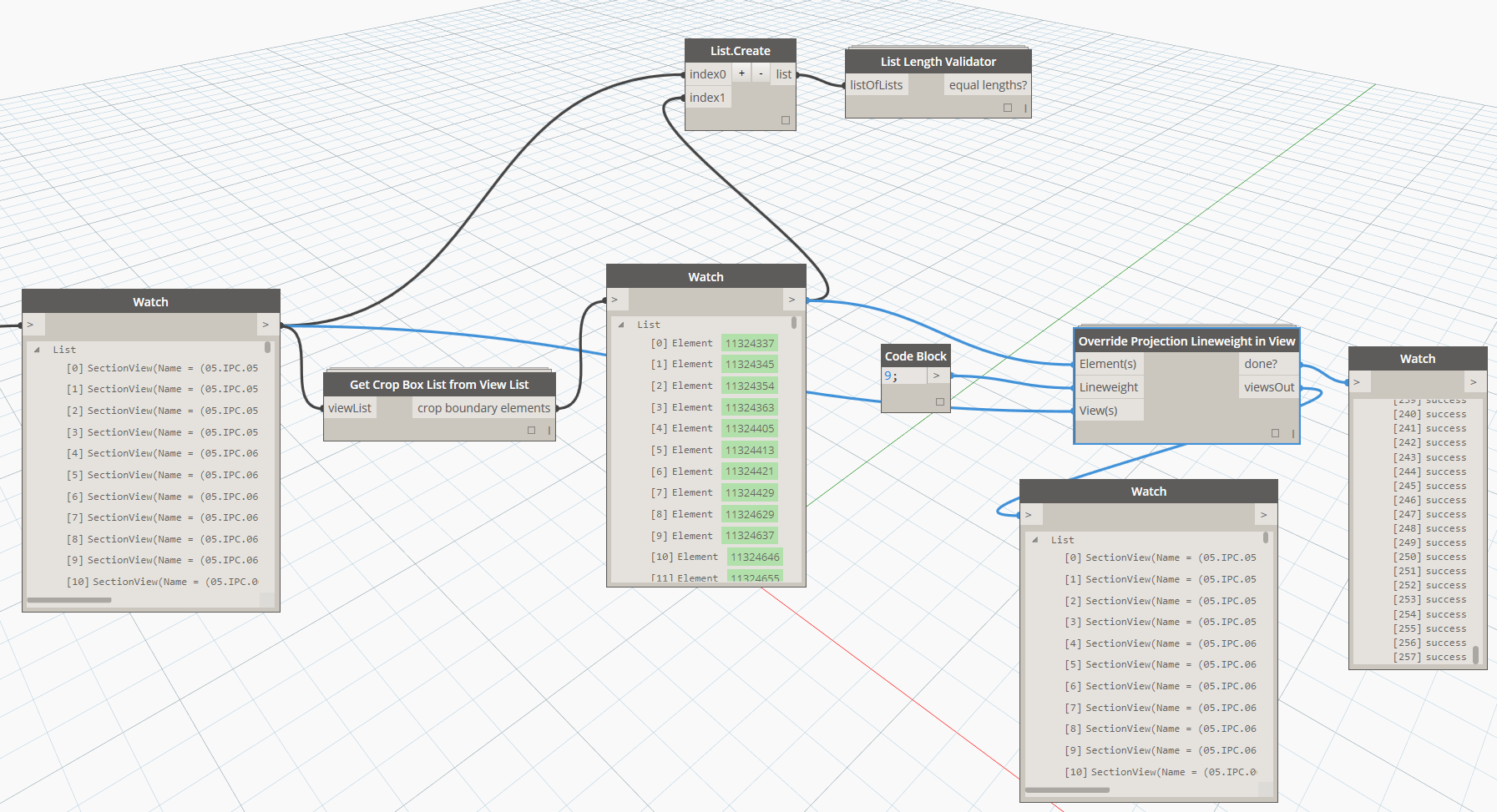 Using a 1:1 set of Views and Elements to override, this node will override the projection lineweight for those elements in the matching view.