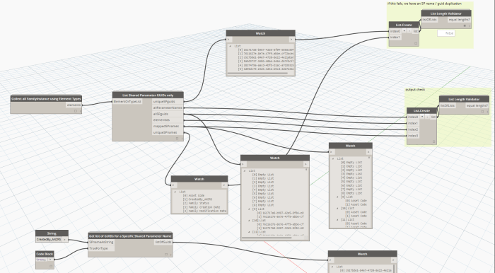 When auditing a Revit model, it is often important to confirm that Shared Parameters have been added correctly. The key piece of information for each Shared Parameter is the ‘GUID’. You can have multiple Shared Parameters in the same model, with the same name, but different GUIDs. This node aims to list shared parameter information using an Element or Type list as input. It iterates through the input list and reports a number of key pieces of information: