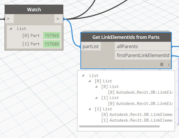 Parts can be created from items in the current (host) model, or from elements in a linked Revit model. In both cases, the ‘source’ or ‘parent’ or ‘original’ element is defined in a LinkElementId object. This node lists the LinkElementId objects for Parts that are input. To determine whether they are from a Link or from Host elements, the LinkElementId object needs to be queried.