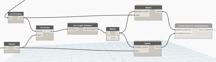 This node simply takes an input set of data, and a Boolean switch. If the switch is true, the data is output. If the switch is false, the output is Empty List. This can be added to control the running of a script with master Boolean switches, or inline validation. In the case below, the List Length Validator confirms the input data has matching lengths, and the true output is used to control the flow in the Switch node.