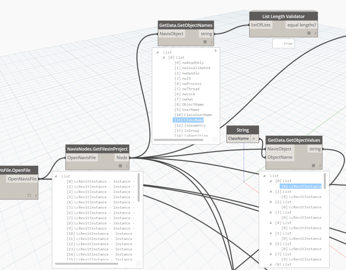 Using an OpenNavisFile object, and a given NavisAttribute, this node will return the Properties of that Attribute. Note how the List.FirstItem is used to prune the attribute list below.