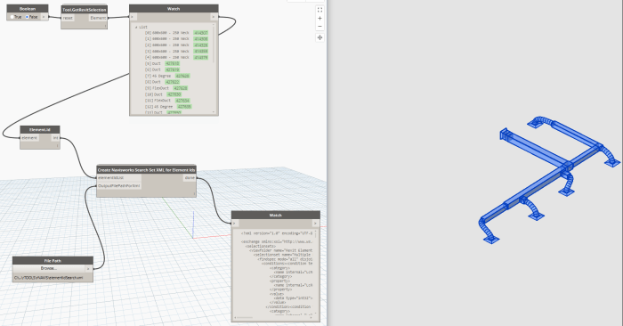 This node is an early proof of concept to demonstrate how a Navisworks search set xml can be built using Dynamo, running from the Revit environment. This example takes an element Id list, and then builds the XML using Core String and WriteToFile nodes. It can then be imported and used in Navisworks.