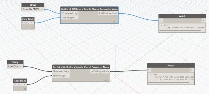 This is an alternative way to summarize the Shared Parameter configuration for the current Revit document. This version checks through a list of family instances in the current project and attempts to get the Shared Parameter GUIDs from them, and then simply returns a list of Shared Parameter GUIDs that match the input SPnameAsString. The Boolean input TrueForType allows you to switch between checking Instance or Type Parameters. As can be seen below, the Asset Code parameter in this model has incorrectly been added twice, and there are two different GUIDs for the same Shared Parameter, which is not good J