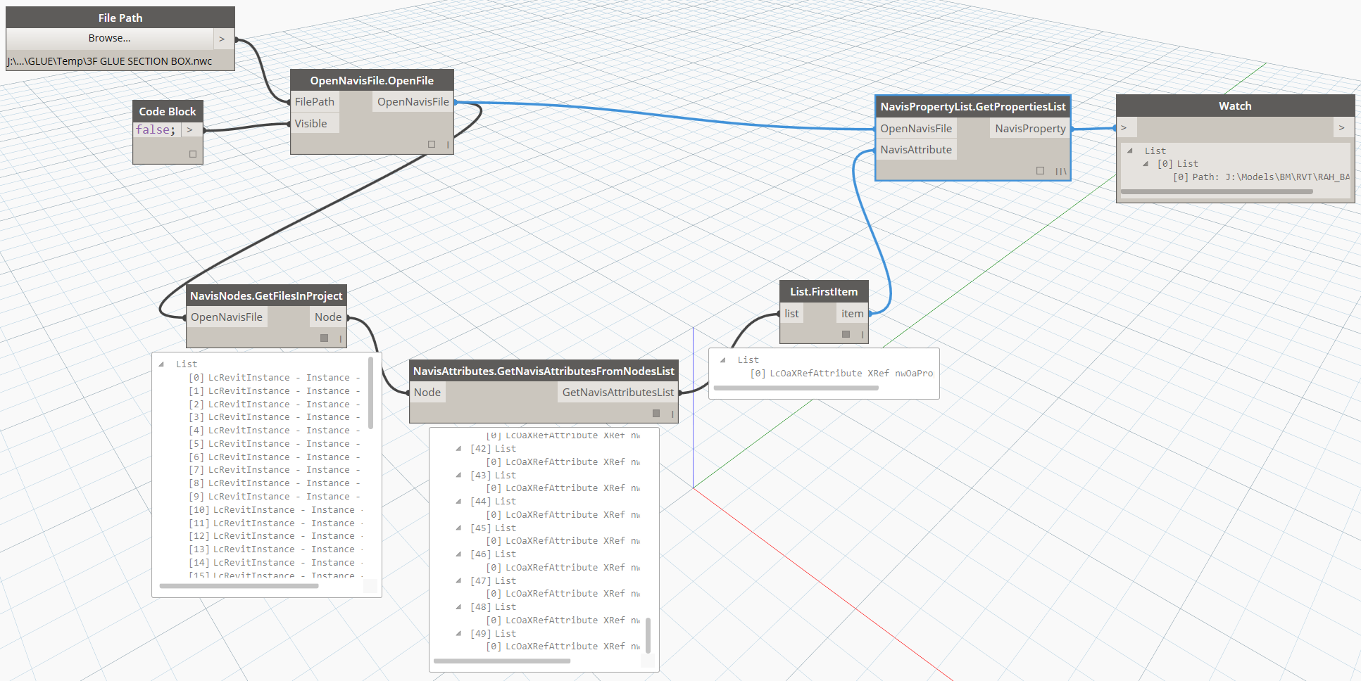 Using an OpenNavisFile object, and a given NavisAttribute, this node will return the Properties of that Attribute. Note how the List.FirstItem is used to prune the attribute list below.